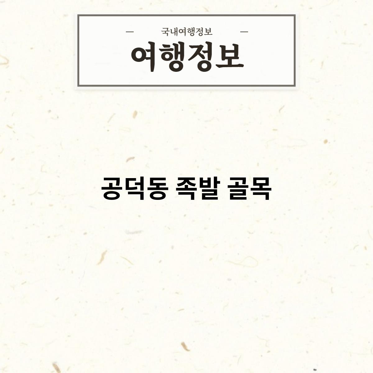 공덕동 족발 골목은 서울 마포구 공덕동에 위치한 족발 골목입니다. 1970년대부터 형성된 골목으로, 30여 개의 족발 전문점이 밀집해 있습니다.