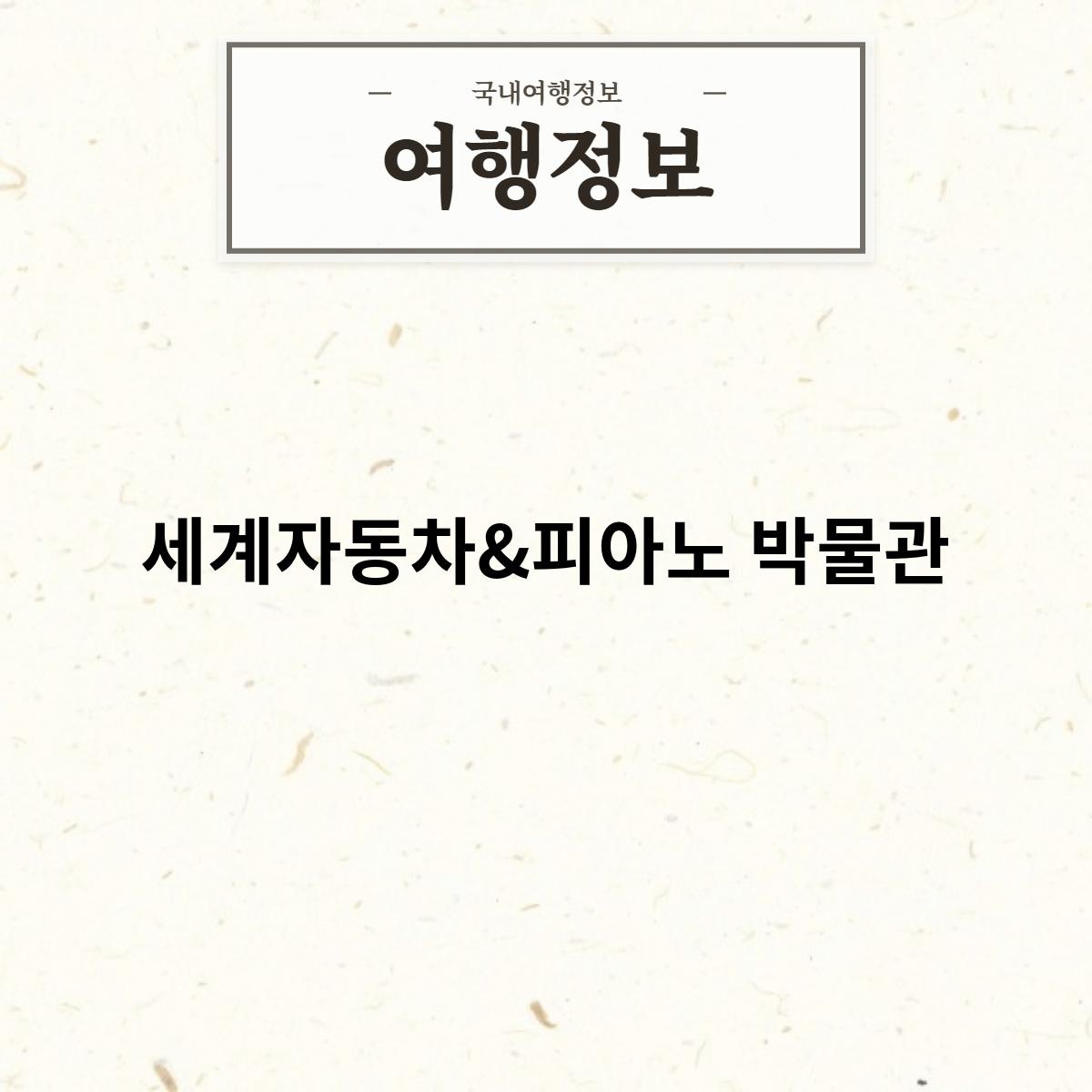 세계자동차&피아노 박물관은 제주특별자치도 서귀포시 안덕면 중산간서로 1610에 위치한 자동차와 피아노를 주제로 한 박물관입니다. 2008년 4월에 개관하였으며, 자동차와 피아노의 역사와 문화를 한눈에 볼 수 있는 곳으로 유명합니다.